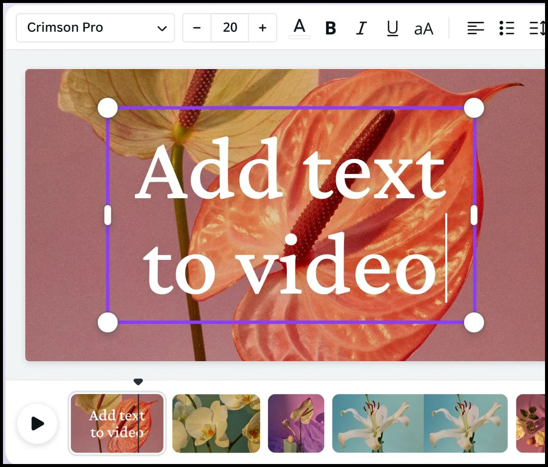 Canva video editor allows you to add text to your videos online and customize them the way you like. Simply open your video in Canva video editor, select the part you want to insert your text into, type in your text and then customize it. For instance, you can add moving text, change font style, adjust text size to match your video, and use Canva media library to select from various premium fonts to add to your videos.