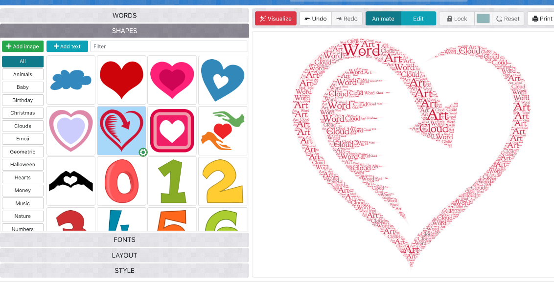 WordArt is a web-based word cloud generator that allows you to easily create beautiful and unique word clouds. WordArt is simple and easy to use and you don’t need graphic design knowledge to start creating amazing word clouds. You can also customize your word cloud art including things such as words, colours, layouts, shapes, and more.