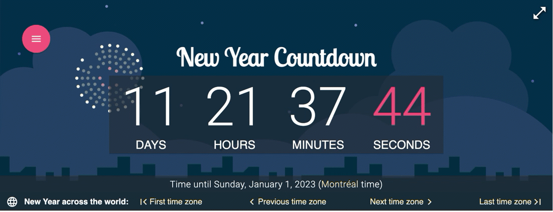 vClock has this simple live New Year’s countdown clock which you can customize to your liking. You can increase or decrease the text font and use the full screen for a better view. You can also share your live New Year countdown on social media websites or use the embed code to embed it on your website or blog.