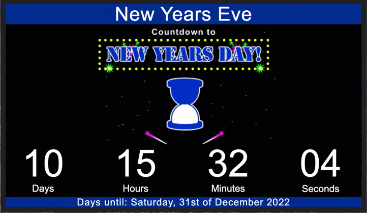 Your Count Down provides an online live New Year’s timer enabling you to countdown to the first day of the New Year The timer shows the number of days, hours, minutes and seconds left to the New Year. Users can save and share the countdown as an image file or save it to Google Calendar.
