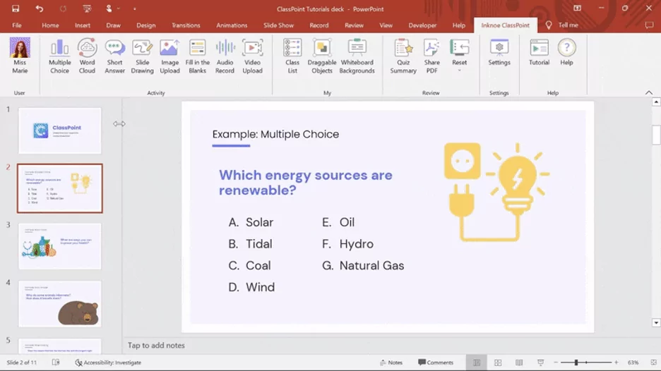 Kahoot’s content library can be a huge boost to using the platform, but ClassPoint’s integration with PowerPoint allows teachers to use their existing presentations and turn it into an interactive lesson without learning a new software.