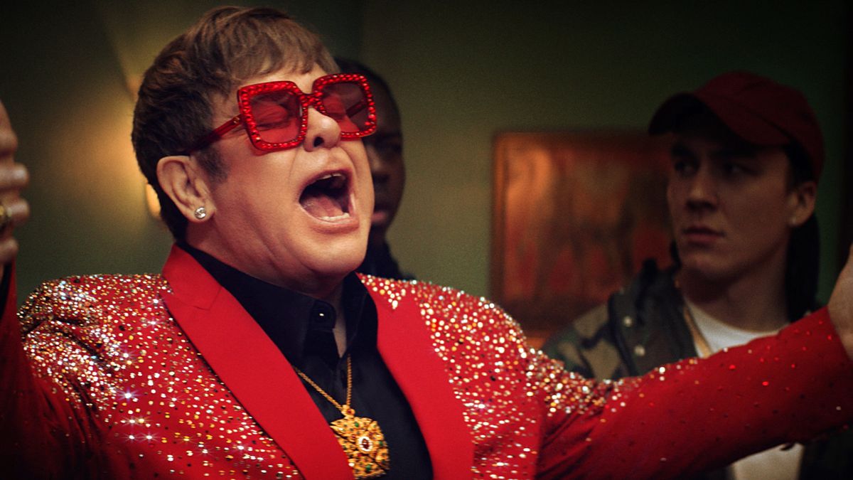 The rundown: The camera smoothly glides from the street into a noisy house party, zeroing in on a crowd of rapt attendees watching a rap battle. After one combatant finishes a fiery performance, the next challenger, Boogie, is called up and the party-goers are instead greeted by … Sir Elton John. John, in a glittering red sequined suit, begins belting out his hit "Don't Go Breaking My Heart" before being told by a fellow emcee to take a step back and eat a snickers, after which he returns to "normal," or as Boogie.