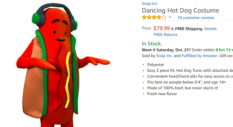 With the new Halloween suit, Snap is clearly trying to translate that popularity into some e-commerce sales that could further drive interest in the character and also accommodate shoppers who are scrambling for last-minute costume ideas (never fear, cooked wiener fans, there's still some in stock). This isn't Snap's first crack at a physical product, following the camera-equipped Spectacles sunglasses that have seen a precipitous drop in sales since launching about a year ago. Like Spectacles, the costume feels more gimmicky than anything, though some may gawk at the $80 price tag.