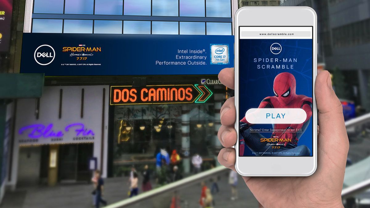- The two are launching a virtual reality (VR) experience that allows viewers to swing around the city like the titular web-slinging hero, available on major VR platforms starting June 30 and with sneak previews at select Cinemark theaters, where Dell hardware will be used for demos. The second promotion is interactive digital billboards in Times Square featuring a "Spider-Man Scramble" game that allows viewers to control a virtual version of the superhero appearing on the outdoor ads by using their smartphones.