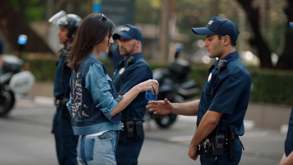 - The spot, which stars Kendall Jenner and was created by Pepsi's in-house Creators League Studio, depicts Jenner abandoning her post at a fashion shoot to join a protest march outside. When the diverse group of protesters encounters a police blockade, Jenner steps out and hands a police officer a Pepsi, which he enjoys, inciting cheers and smiles from the crowd.