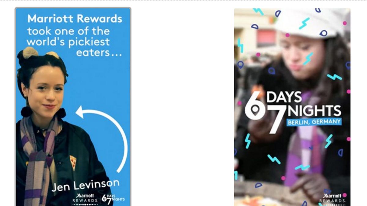 Marriott's Snapchat series stars a number of social influencers, including Tom Jauncey of Beautiful Destinations, Diipa Khosla, Sara Hopkins and Jen Levinson. To start each episode, the hosts lay out their "mission" for the week and then set out to accomplish that goal (for example, picky eater Levinson expands her food horizons with currywurst and frog legs in Berlin).