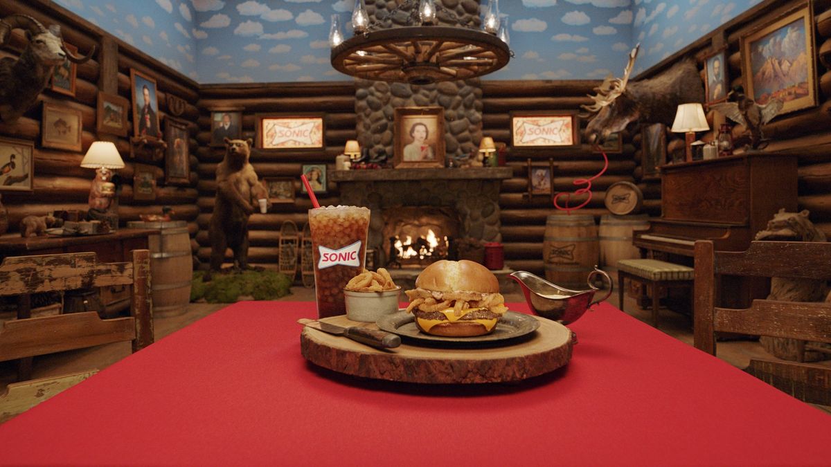 Sonic Drive-In today (Sept. 26) launched a new advertising campaign, "Mmm. Sonic," that offers an imaginative, dreamlike take on the quick-service restaurant’s food. In the first spot, "Chophouse," a despondent dad sits in the bleachers at his child's football game before the camera zooms through his eye into a fantasy where he’d rather be — a lodge serving the brand's limited-time Chophouse Cheeseburger — before zooming out to reveal him eating the burger. The ad is set to a folksy, banjo-heavy jingle.