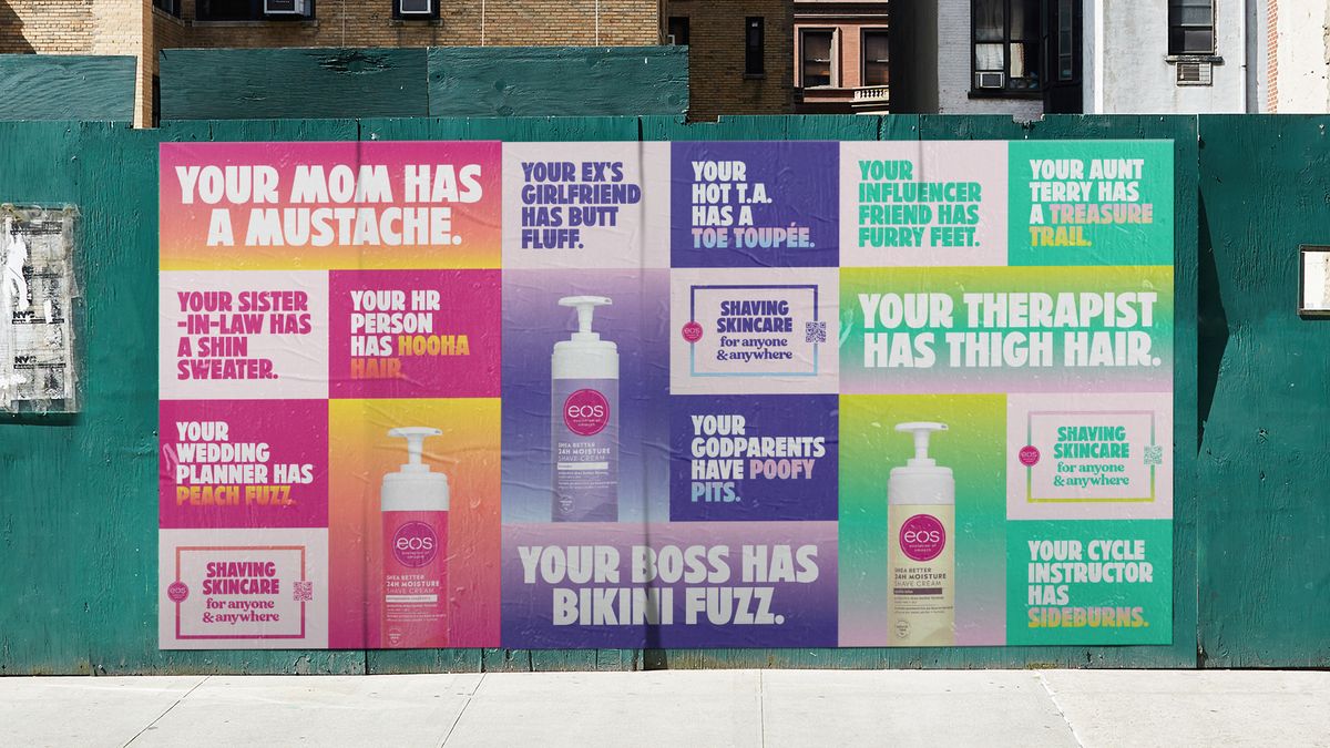 For skincare brand Eos ("Evolution of Smooth"), that kind of normalization is good, but doesn't go far enough. With this summer's "Shaving Skincare for Anyone & Anywhere" campaign, Eos is rethinking the why and where of women's shaving with funny campaign spots and eye-catching out-of-home ads. The campaign was inspired by the insight that consumers were already using Eos shaving products all over their bodies, a fact that the brand chose to highlight and celebrate.