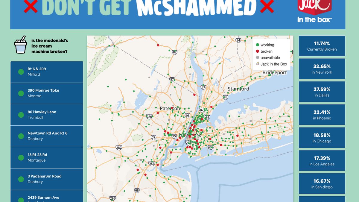 McDonald's is notorious for its ice cream machines being broken, to the point where the chain has faced a $900 million lawsuit and an FTC investigation. Jack in the Box's effort revolves around a takeover of McBroken.com, a website launched in October 2020 that taps into the McDonald's mobile API to determine if the ice cream machine is working at the chain's locations.
