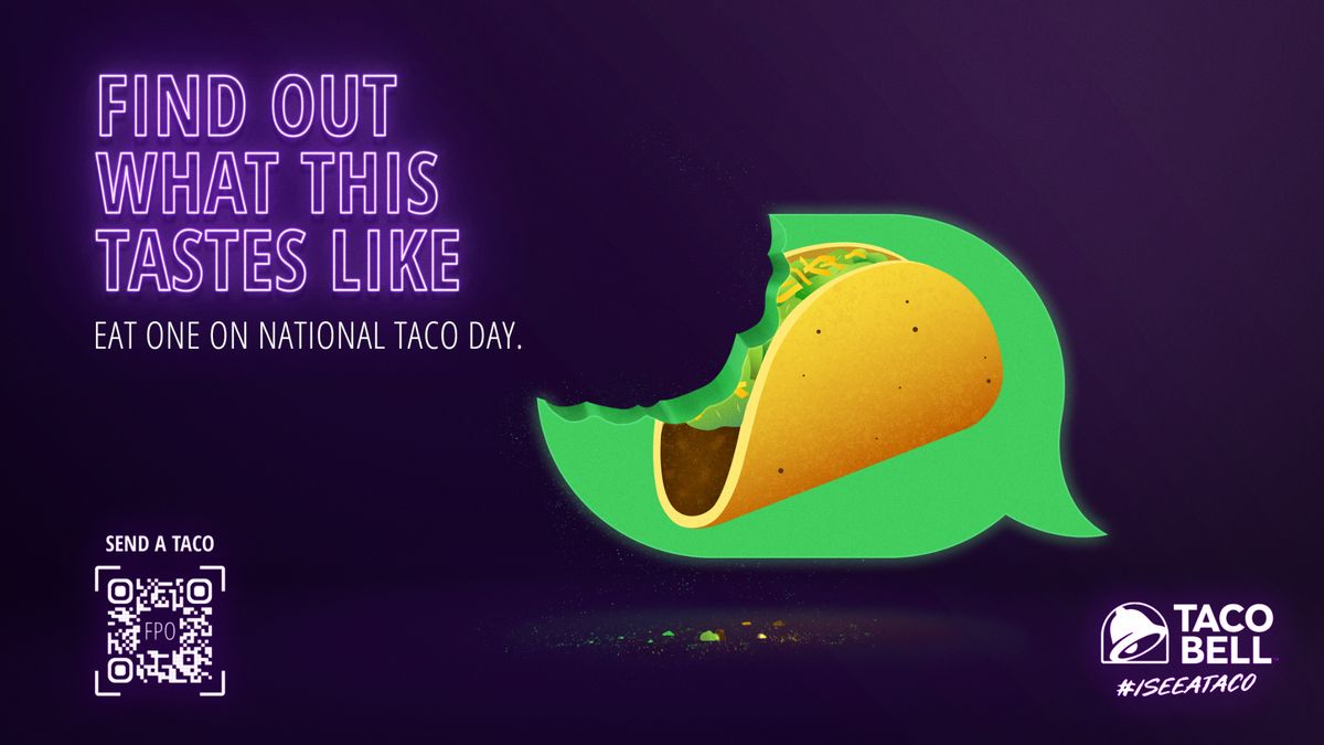 - The latest incarnation of the chain's marketing focus on National Taco Day includes an international push, with fans able to earn a free taco by messaging a taco emoji to a designated number. The number will be made available via QR codes and short URLs, available on out-of-home (OOH) ads and social media, respectively, that open consumers' messaging app, WhatsApp or SMS platform with a taco emoji pre-populated. Participants receive the special offer and a GIF after they send the message.