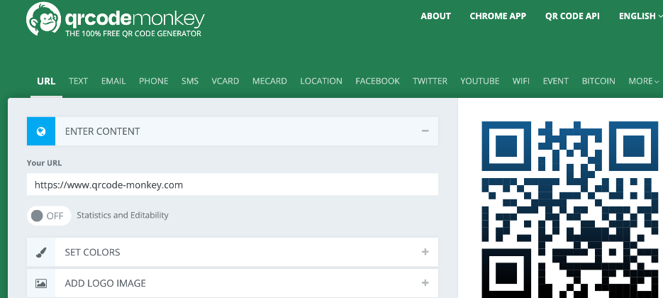 QR Code Monkey is a free QR Code generator that allows you to create various types of QR-Codes for data such as text, sms, email, vcard, mecard, social media websites, URLs, and more. QR Code Monkey also lets you add your personal logos to the QR Codes you create. You can also customize the colour of your codes the way you want. Once your QR Code is ready you can download it in PNG, SVG, PDF, or EPS format.