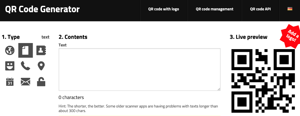 To create a QR Code, “just enter your text, your URL, a SMS or vCard contact information. The QR code will be generated automatically as you type. Just click on the “Download” button to get the created QR code image then (the image is available as EPS or SVG vector graphic, as well as high-resolution PNG, GIF or JPEG raster graphics format).