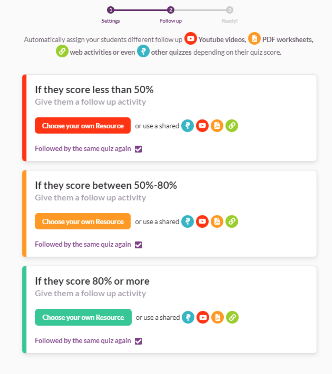 Compared to other game-based tools, three main features in Quizalize stood out to me: Follow-up activities, the inclusion of curriculum standards, and text-to-speech. As for the first feature, it is especially helpful in providing differentiated learning. As students take quizzes, teachers analyze students scores and identify learning problems and based on the generated results they provide follow-up activities and resources.