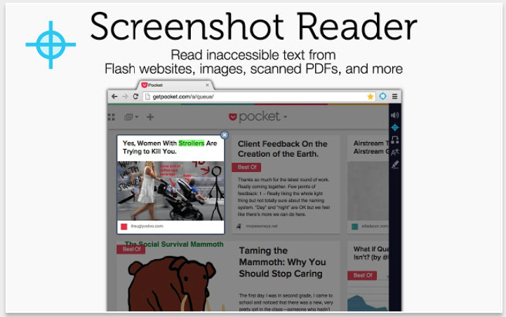 ‘Snap&Read Extension for Chrome™ reads both accessible and inaccessible text aloud from websites, Flash websites, images, Google Docs, eBook Readers, Kindle Cloud Reader, email, PDFs, web-based tests, and more. Snap&Read also adjusts complex text to be more readable, translates text into over 100 languages, and allows you to capture information and cite your sources for use in writings.’
