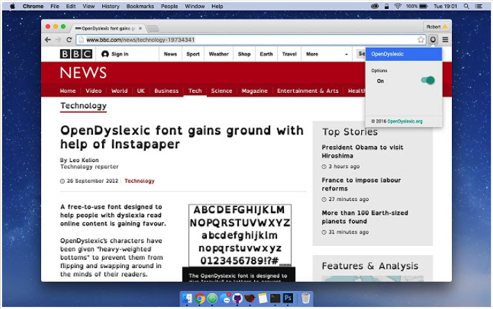 ‘Open-Dyslexic is an open sourced font created to increase readability for readers with dyslexia. This extension overrides all fonts on webpages with the OpenDyslexic font, and formats pages to be more easily readable.’