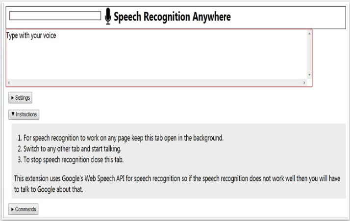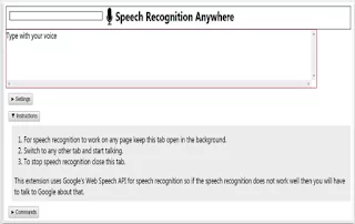 ‘With “Speech Recognition Anywhere” you can control the Internet with your voice. Use Speech Recognition to fill out any input, textarea, form or document on the web! ’