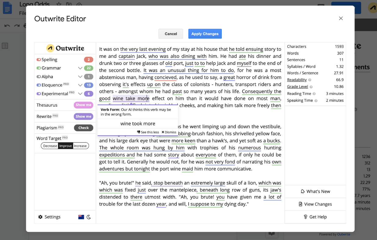 Outwrite is another great Docs extension to use to enhance your writing. Its features include a grammar and spelling checker , a plagiarism checker, a punctuation checker, a paraphrasing tool, eloquence suggestions to enhance your writing clarity, and many more. Outwrite works with various apps and across different devices and platforms.