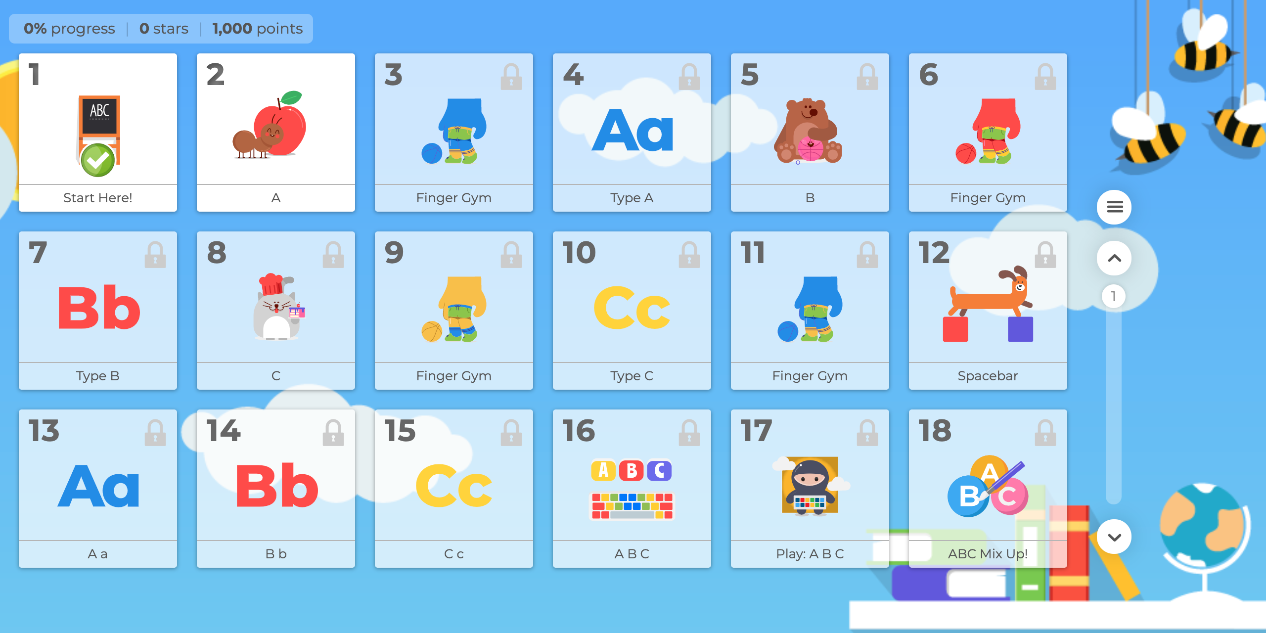 TypingClub recommends that you start with the first lesson and work your way up. Each lesson has a minimum score you need to achieve in order to move to the next one. You can try as many times as it takes you to complete before you move to the next lesson.
