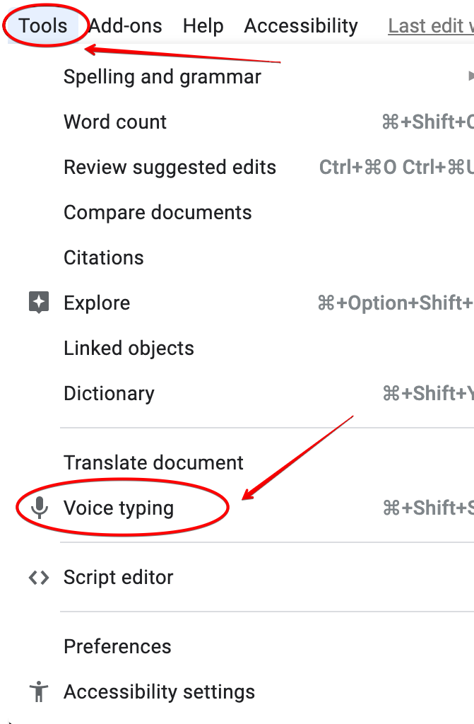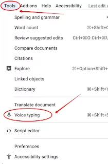 To access this feature, open a Google document, click on Tools ➜ Voice Typing. When you want to speak click on the microphone.