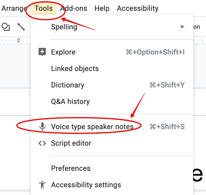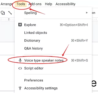 To activate speech to text on Slides, open a Slides presentation, click on Tools ➜ Voice Type speaker notes
